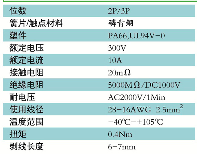 接線(xiàn)端子的絕緣材料用改性的尼龍(PA66),能達(dá)到或超過(guò)IEC947-7-1EN60947-7-1標(biāo)準(zhǔn),阻燃等級(jí)達(dá)到UL94,V-0具有良好的電氣性能和機(jī)械性能。螺絲用高強(qiáng)度的鋼制成鍍鋅或鎳處理,導(dǎo)電體四方針用合金銅制成表面鍍錫,壓片采用彈性及極強(qiáng)的磷青銅表面鍍錫或鎳;壓線(xiàn)框用抗應(yīng)力裂縫腐蝕的合金銅制成,這些金屬表面還鍍錫或鍍鎳加以保護(hù)。設(shè)計(jì)完全符合IEC60947-7-1.GB14048.7等標(biāo)準(zhǔn)。